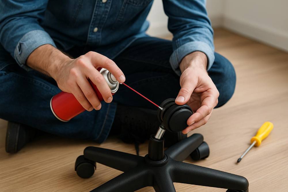 اگر چرخ صندلی شما صدا میدهد و علائم خرابی فیزیکی ندارد، احتمالاً زمان استفاده از روانکنندهها فرا رسیده است. بهترین زمان برای این کار وقتی است که چرخ هنوز سالم است اما بهدلیل اصطکاک خشک، صدا ایجاد میکند. برای روانسازی، ابتدا چرخ را باز کرده و هرگونه گرد و خاک یا موهای گیرکرده را تمیز کنید. سپس از اسپری روانکننده سیلیکونی یا روغن صنعتی سبک استفاده کرده و آن را به محور چرخ بزنید. دقت داشته باشید که از روغن موتور یا مواد چسبناک استفاده نکنید چون گرد و غبار را بیشتر جذب میکنند. پس از اسپریکردن، چند بار چرخ را بچرخانید تا روانکننده بهخوبی پخش شود. این روش در بسیاری از موارد، صدا را بهطور کامل از بین میبرد.